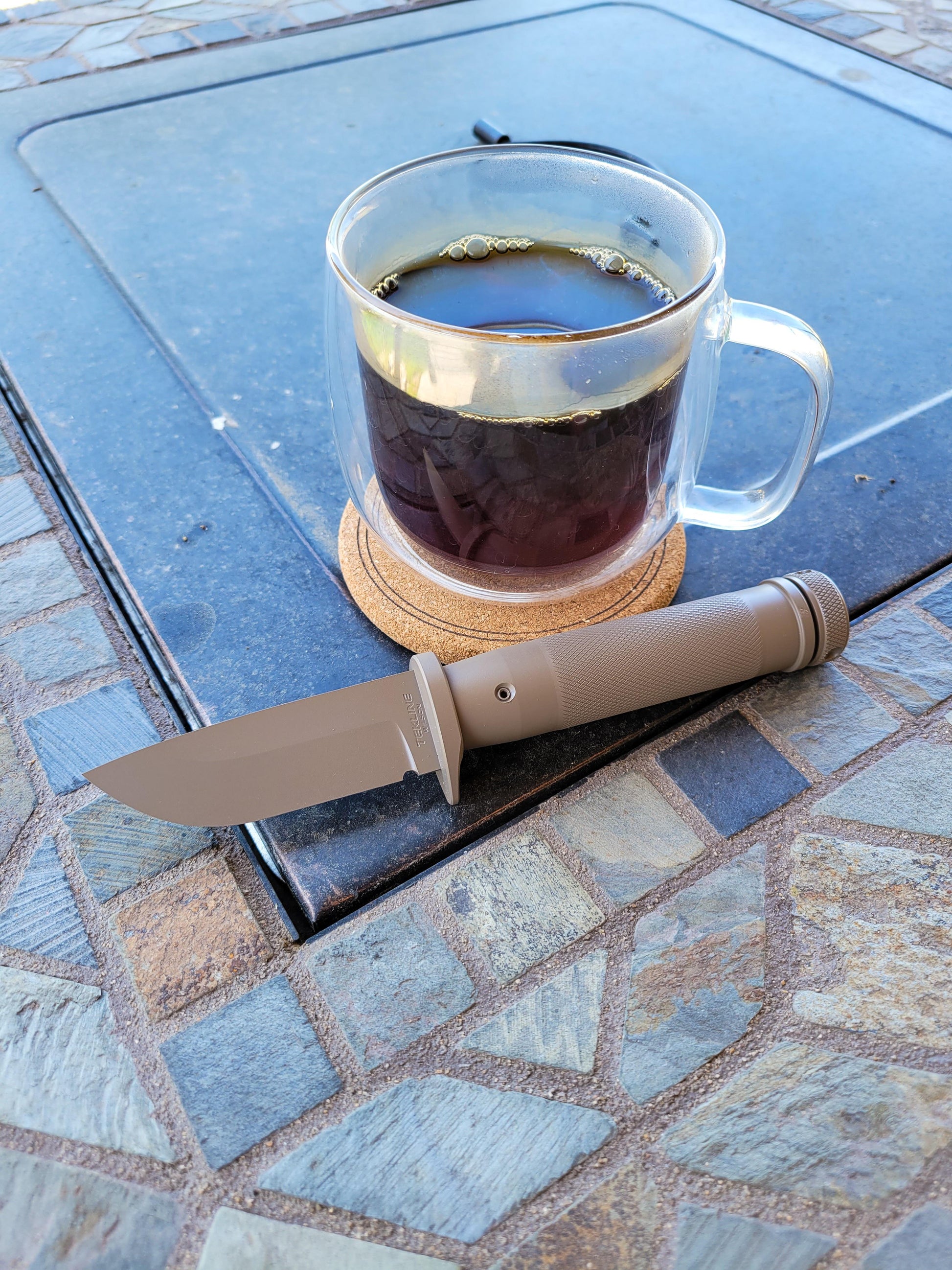 This is our Desert Tan color, very similar to Flat Dark Earth. The full GunKote option gets the entire knife (blade/guard/handle/buttcap) finished in premium KG GunKote, a very thin, durable baked on coating that is virtually immune to solvents and protects from corrosion and wear. The finish is able to be reapplied if sent in for "spa service," and color can be changed at that time, also.