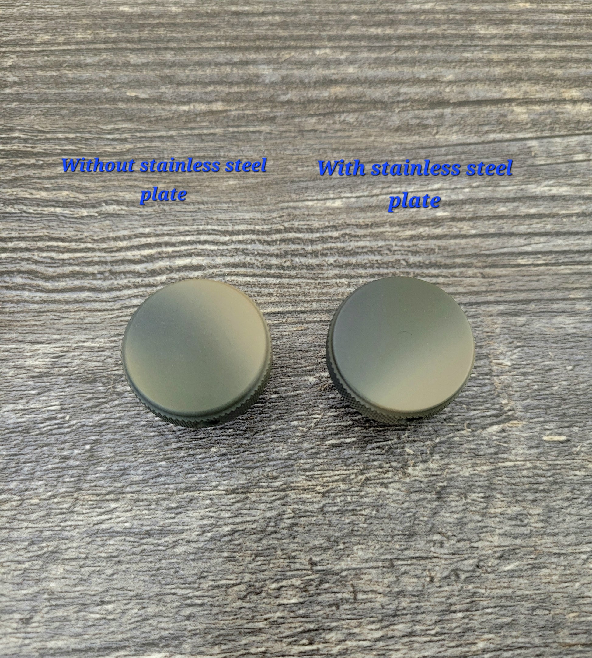 Some of the anodized finish is machined off in the process, so the entire buttcap is finished in OD green Gunkote. Pictured here is a steel plated buttcap in satin finish for reference. Visually the non plated and plated versions are nearly identical. You can see the thin steel plate at the top of the cap.