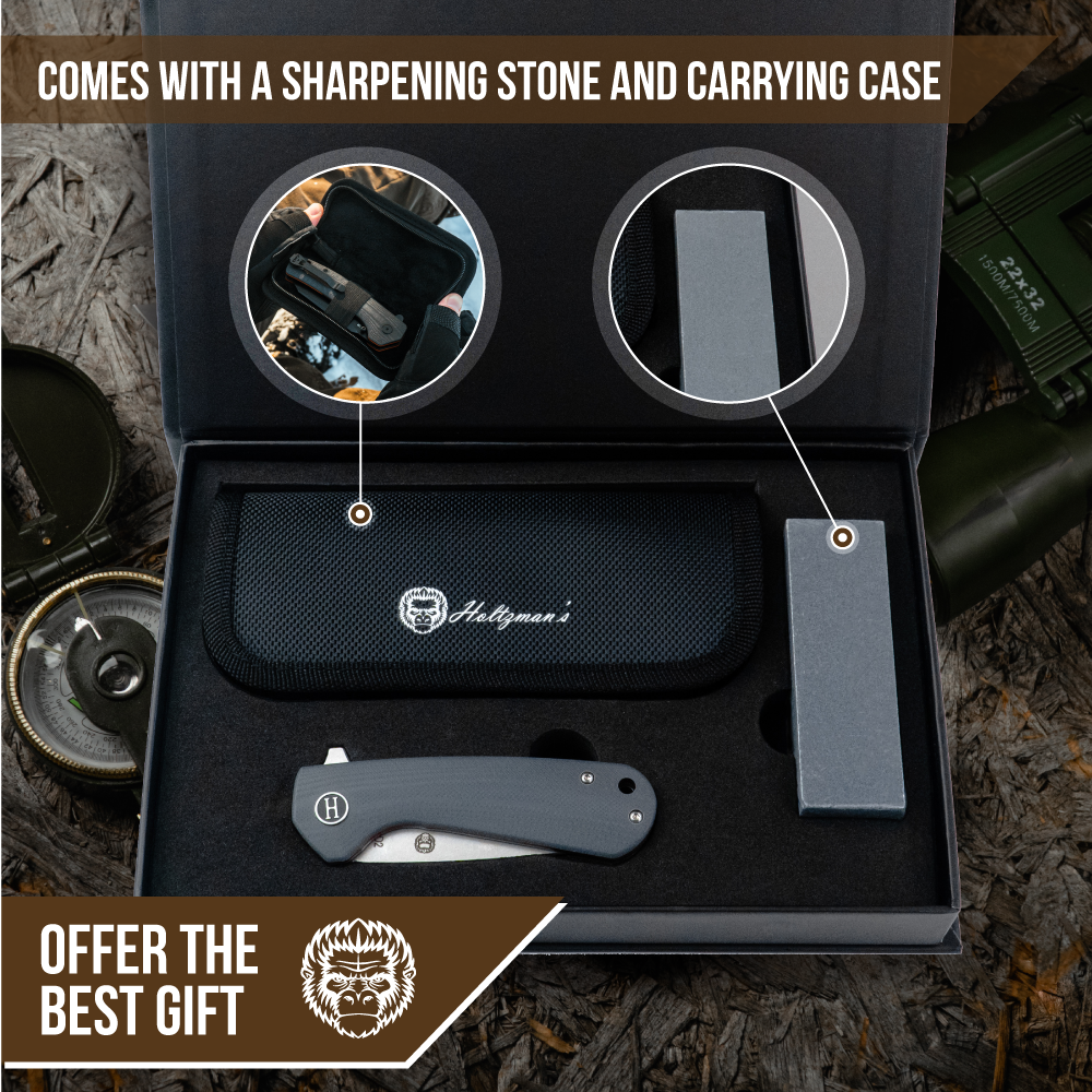 - ✅ GET YOUR HANDS ON A COMPLETE POCKET KNIFE KIT: The sharpening stone will make sure your blade is always razor sharp and the carrying case will keep your EDC knife safe and always at hand.